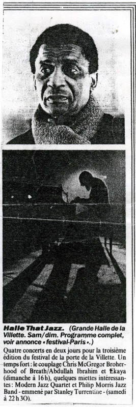 - Photocopied article in French about the music festival Halle That Jazz, in Paris (France). There is also 2 pictures with this article. The top picture shows Abdullah Ibrahim and the bottom picture shows Chris McGregor playing piano on stage.