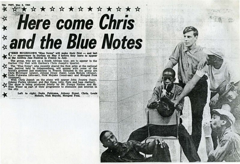 - Photocopied article from the newspaper The Post about Chris McGregor's Blue Notes playing in Durban before the band leaves for France and the Antibes jazz festival. There is a picture of (from left to right) Dudu Pukwana, Johnny Dyani, CHris McGregor, Louis Moholo, Nick Moyake and Mongezi Feza with this article.
