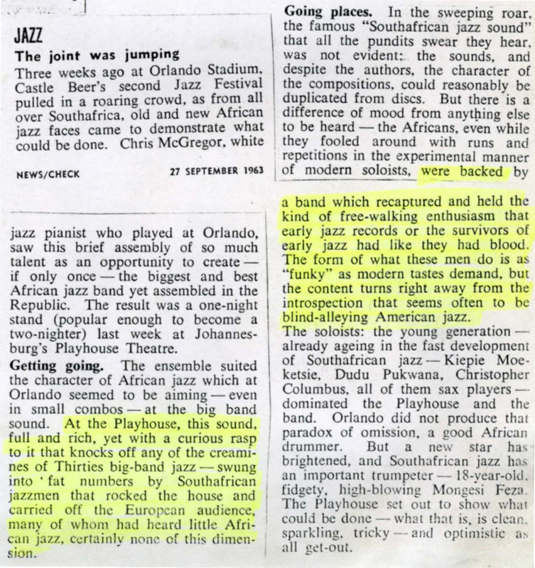 - Photocopied article about the concert of Chris McGregor who assembled "the biggest and best African Jazz band in the Republic" at the Castle Beer's second Jazz Festival at Orlando Stadium.