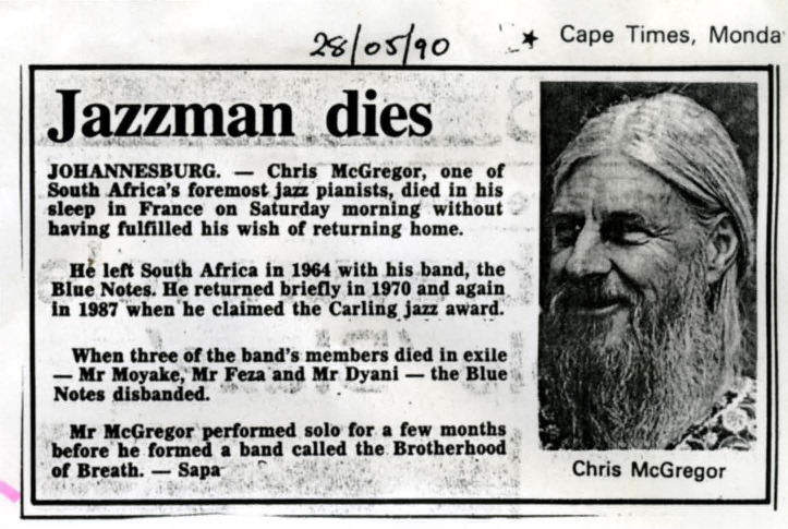 - Photocopied obituary of Chris McGregor from the newspaper Cape Times. A picture of Chris McGregor is also accompanying this article.