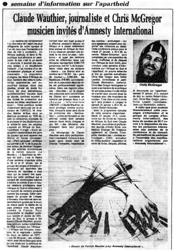 - Photocopied article from the newspaper le Républicain Lorrain about the week of conferences organised by Amnesty International with Claude Wauthier. Chris McGregor with his trio will be performing at the end of the week. There are 2 pictures with this article. The top picture is a portrait of Chris McGregor and the bottom picture is a drawing by Patrick Rauzier for Amnesty International.