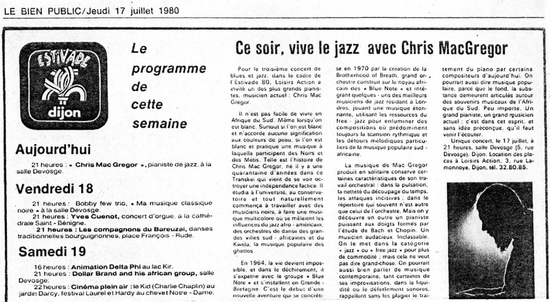 - Photocopied article from the French newspaper Le Bien Public about a jazz festival in Dijon, France, where Chris McGregor's Brotherhood of Breath will be playing amongst other musicians and bands.