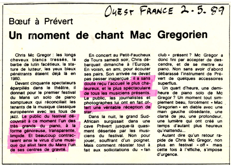 - Photocopied article from the French newspaper Ouest France about Chris McGregor giving an improvised concert in a cave during the Mans (France) music festival. He wasn't part of the festival program and just came as a spectator, but he was asked by his fans to improvise songs on a piano, even though he had a sore on his left wrist.