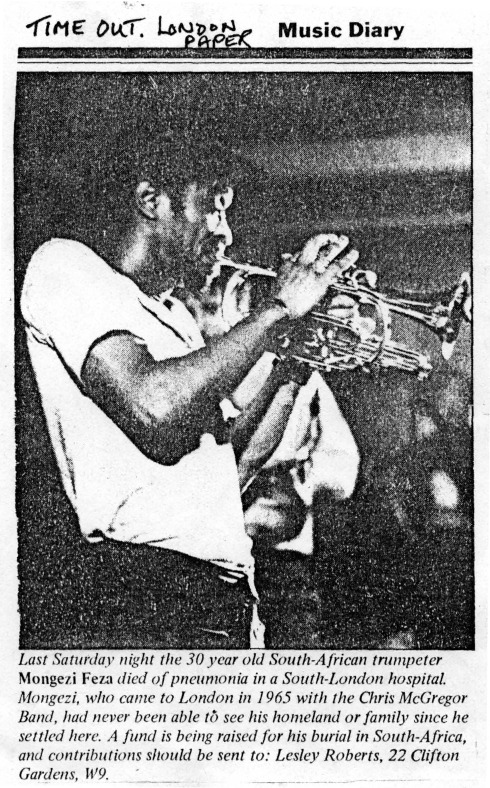 - Photocopied article from the English newspaper Time Out about Mongezi Feza's death. There is a photo of Mongezi Feza playing trumpet with this article.