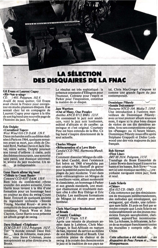 - Photocopied article in French about the new released album of Chris McGregor's Brotherhood of Breath "Country Cooking". There are also various short articles on other recordings by Eric Dolphy, Charles Mingus, etc.