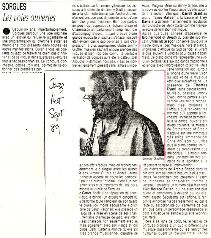 - Photocopied article from the French magazine Jazz Hot about the International Jazz Festival of Sorgues, France, with the participation of Chris McGregor's Brotherhood of Breath and Archie Shepp. A photo of the saxophonist Jimmy Giuffre, who's also playing at the festival the day before McGregor's performance, is accompanying the article.