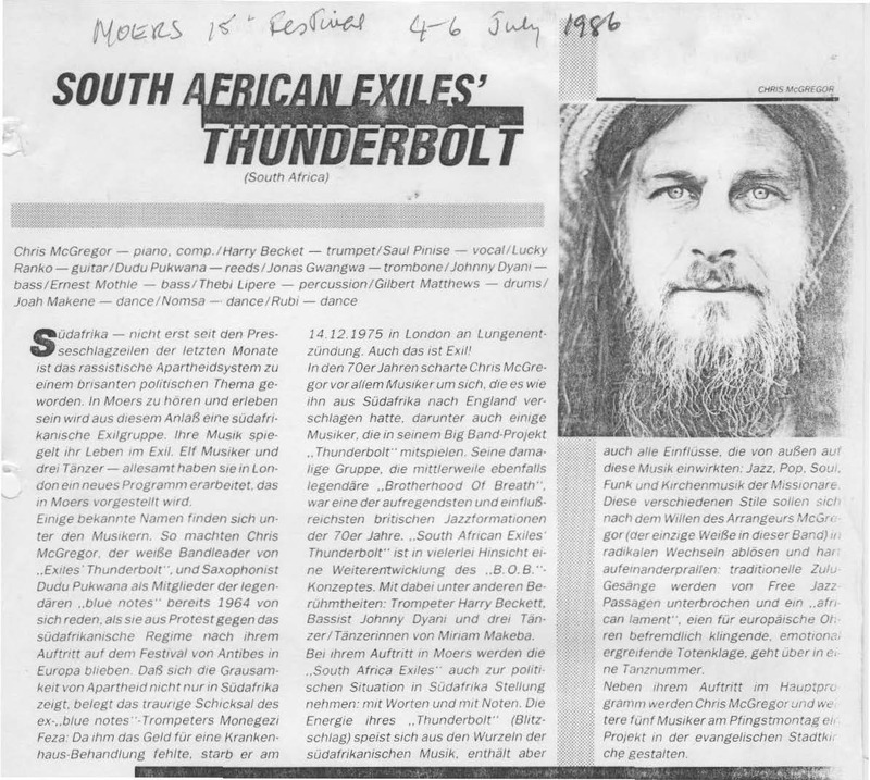 - Photocopied article in German about Chris McGregor's Brotherhood of Breath concert at the Moers 15th Music Festival, in Germany. There is a portrait of Chris McGregor with this article.