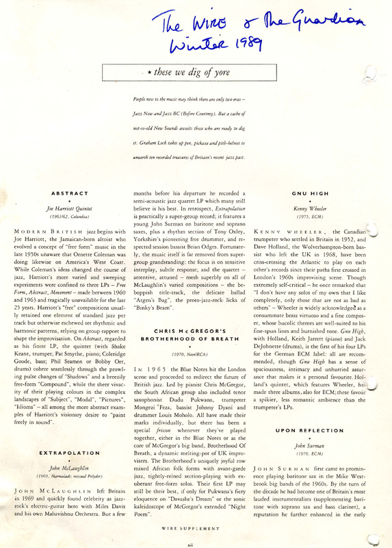 - Short photocopied articles from The Wire Supplement on old musicians such as Chris McGregor and his Brotherhood of Breath, Kenny Wheeler, John Surman, etc.