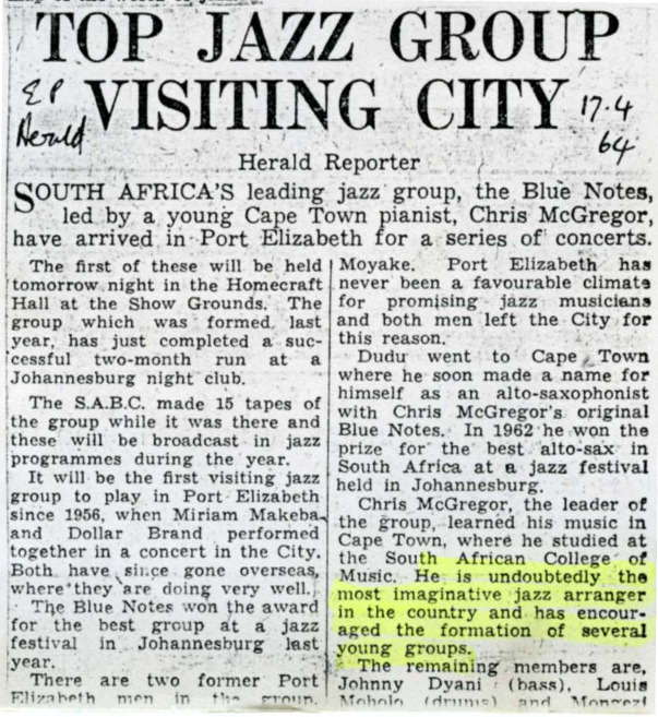 - Photocopied article from the newspaper EP Herald Mail about Chris McGregor's Blue Notes coming to Port Elizabeth for a series of concerts. There is a picture of Nick Moyake playing Tenor saxophone with this article.