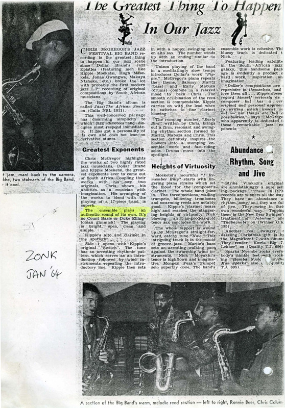 - Photocopied article from the newspaper Zonk about the recordings Jazz/The African Sound by Chris McGregor and the Castle Lager Big Band. There are two pictures with this article. The top one shows a tenor saxophonist and 4 saxophonists are playing on the bottom picture (from left to right: Ronnie Beer, Chris Columbus, Dudu Pukwana).