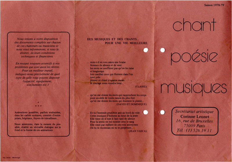 - Original program for the 1978-79 season of the music festival "Chant, poésie, musique" in Paris, France.