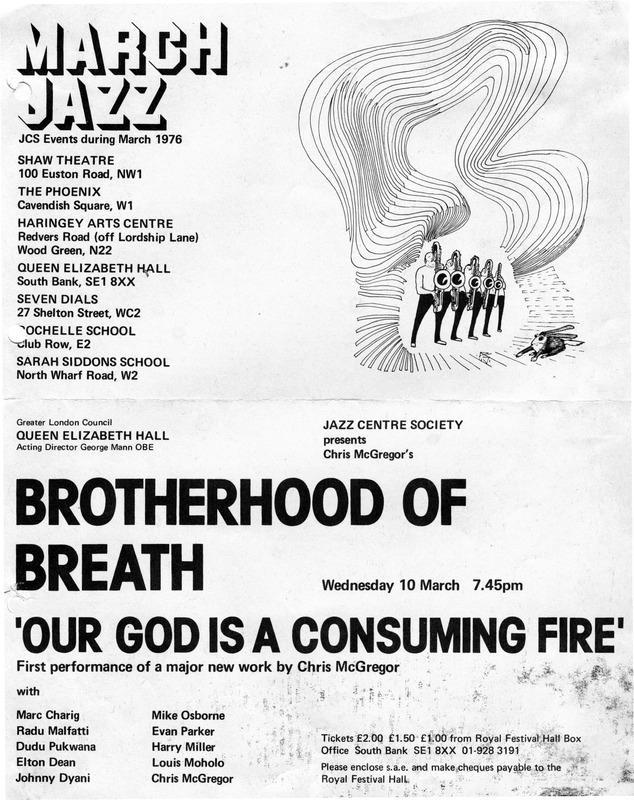 - (1976) Chris McGregor's Brotherhood of Breath: Our God is a consuming fire. In: March Jazz, Wednesday, 10th March 1976, Queen Elizabeth Hall, London.