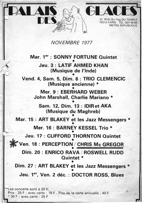 - Original poster for November 1977 concerts at the Palais des Glaces, in Paris, France, where Chris McGregor is going to play.