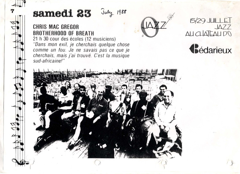 - Photocopied flier for the Festival Jazz au Chateau d'O in Bédarieux, France. The festival was held from the 15th to 29th July 1988. There is a citation from Chris McGregor written in French: "In my exile I was looking for something like a crazy man. I didn't know what i was looking for, but I found it. This is the music from South Africa!". There are 2 pictures. In the front page a photo of the band Brotherhood of Breath and on the back page 11 small photos of the members of the band.
