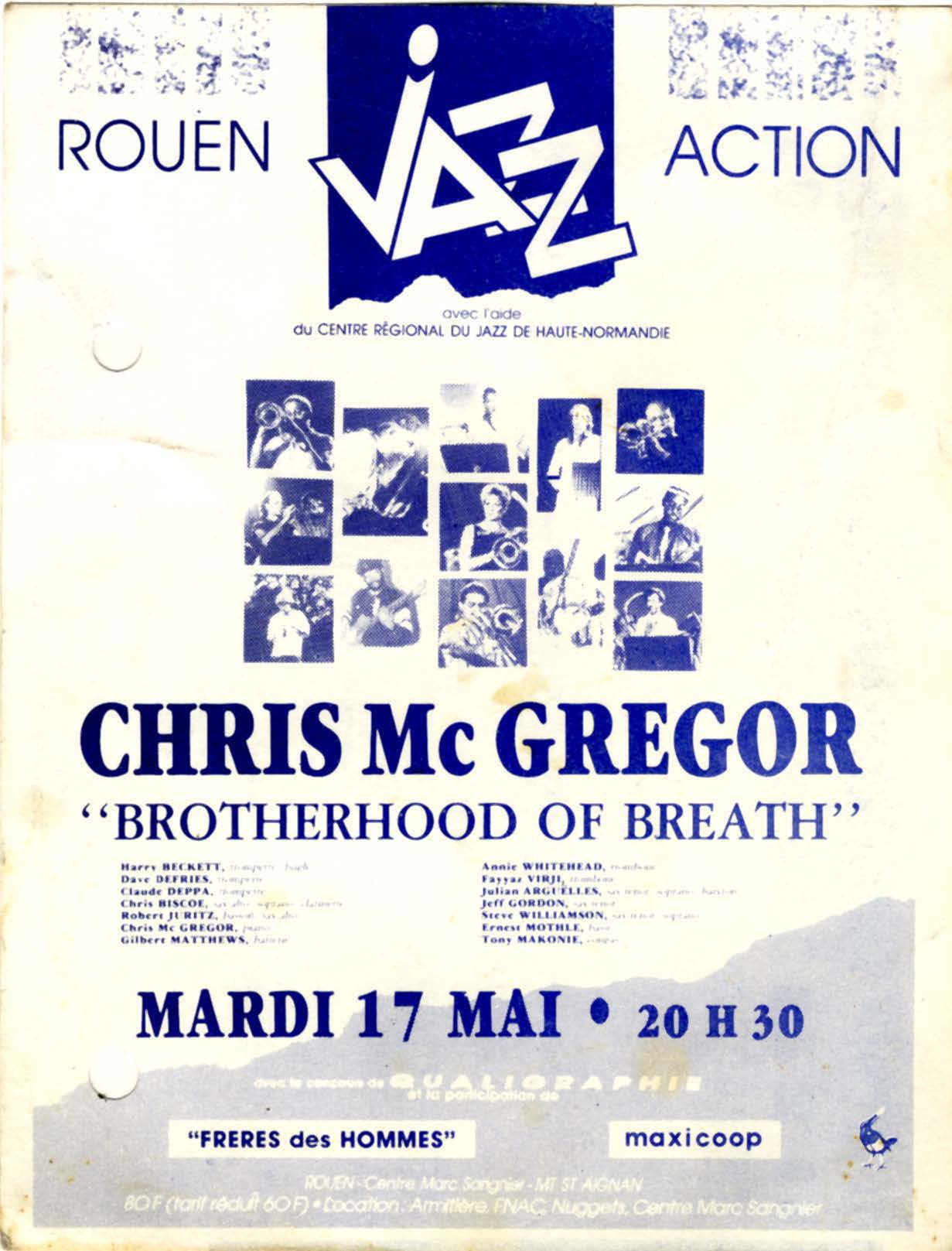 - Flier announcing a concert of Chris McGregor with the Band Brotherhood of Breath at the Rouen Jazz Action, France.