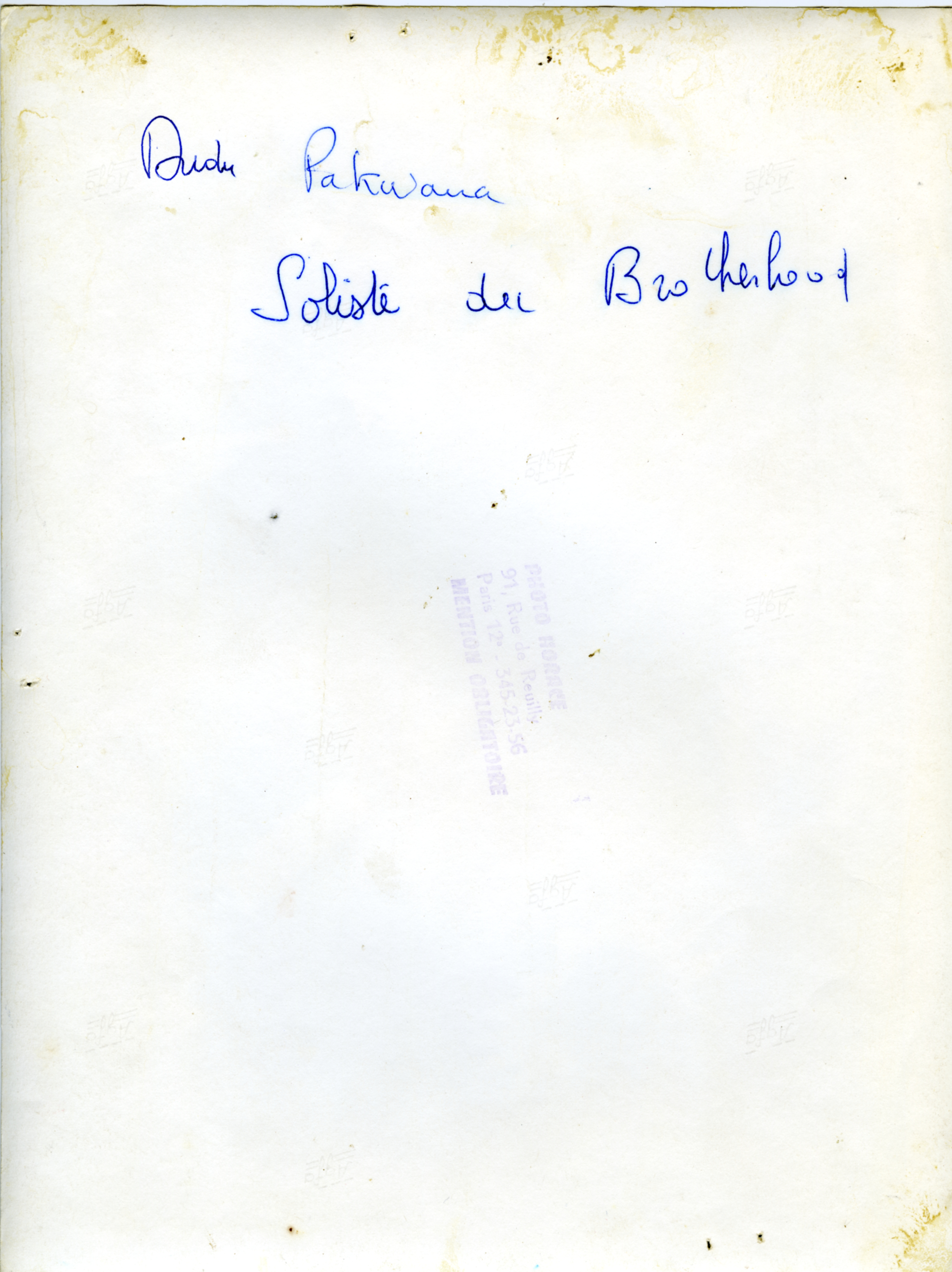 - Photo in black and white (front and back) of Dudu Pukwana playing Alto Saxophone. Translation of the French at the back of the photo: "Soloist of Brotherhood"