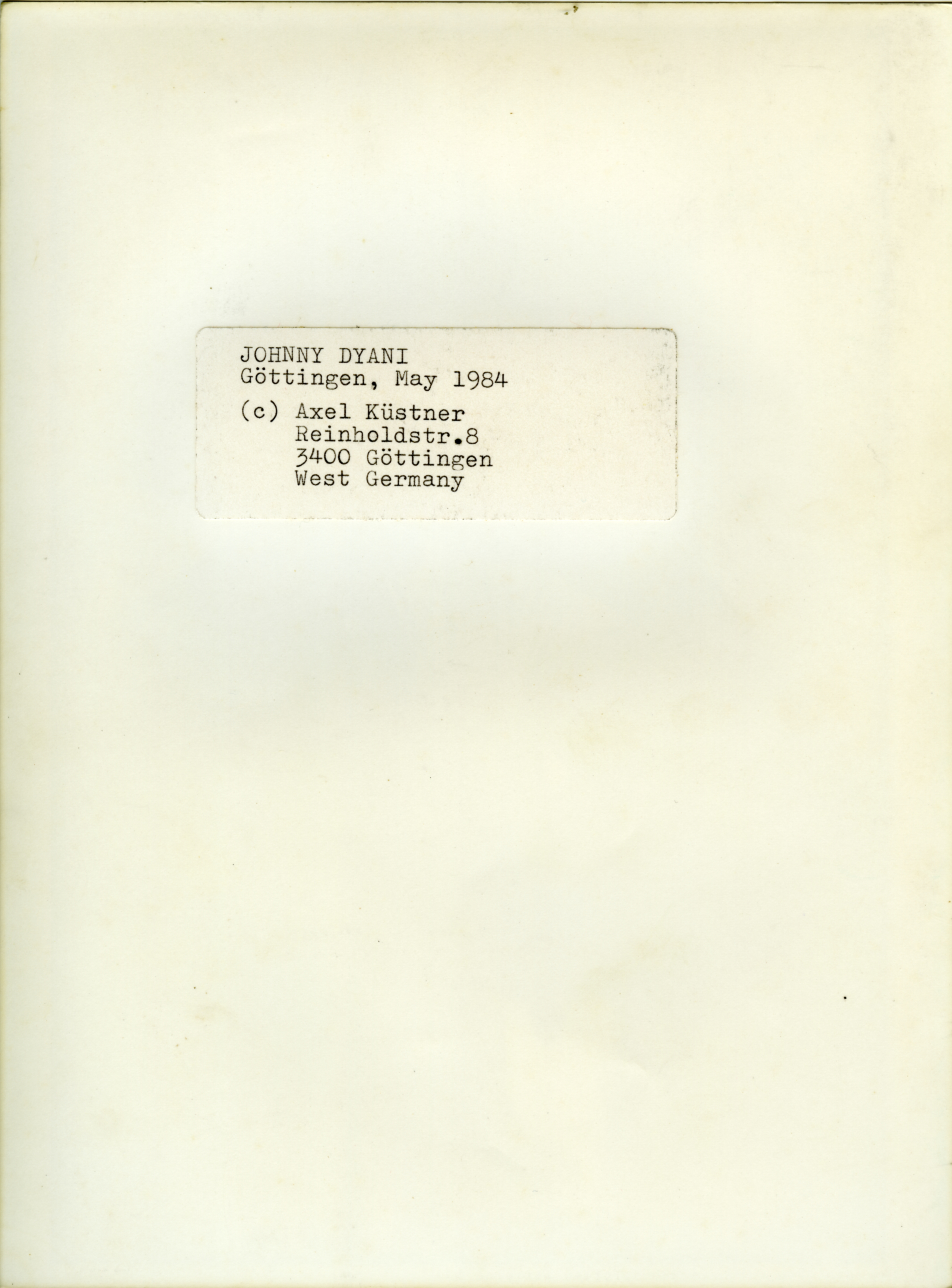 - Photo in black and white (front and back) of Johnny Dyani playing Double Bass in Göttingen in May 1984