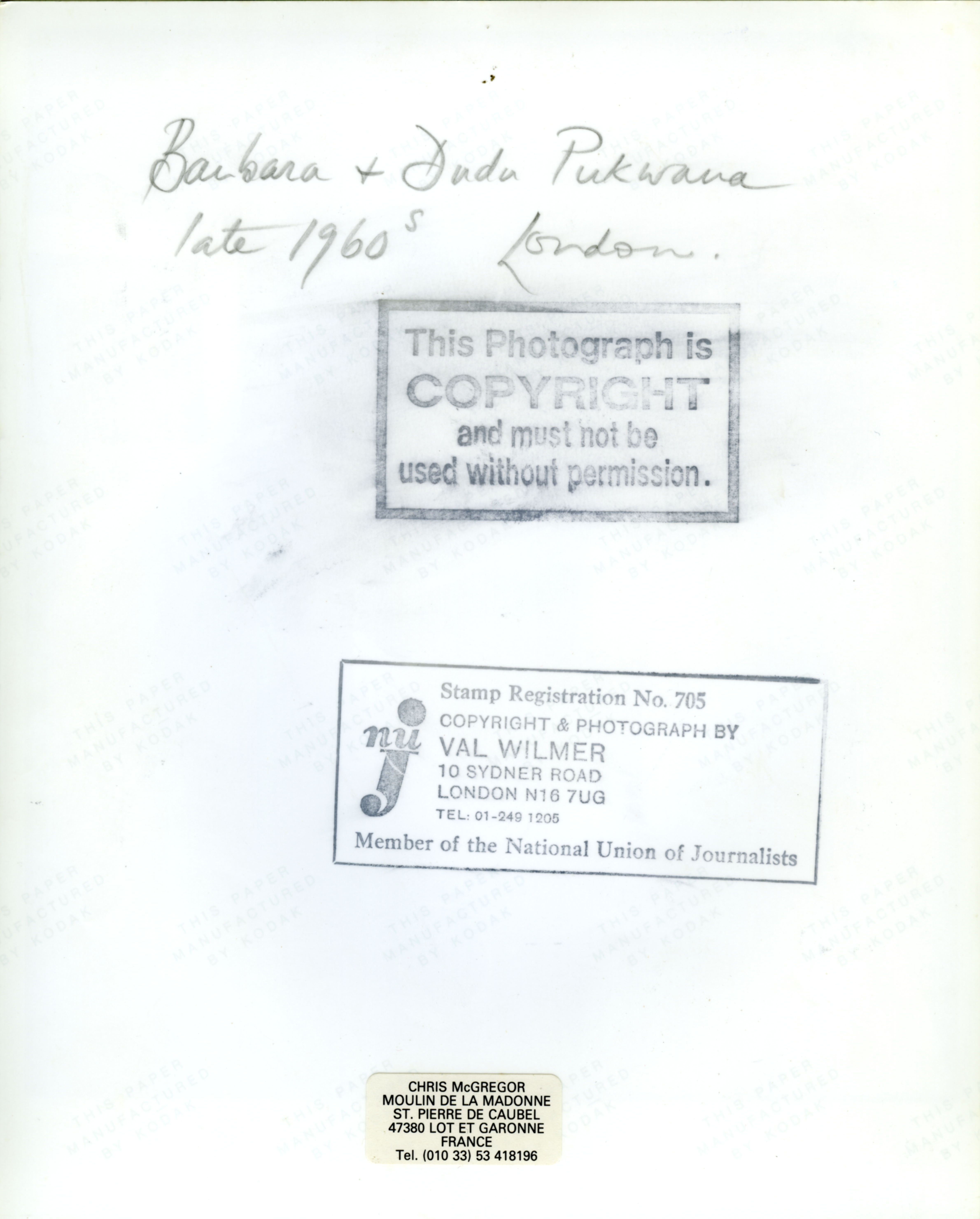 - Black and white photo (front and back) of Barbara and Dudu Pukwana at home in London, the 27th of July 1968