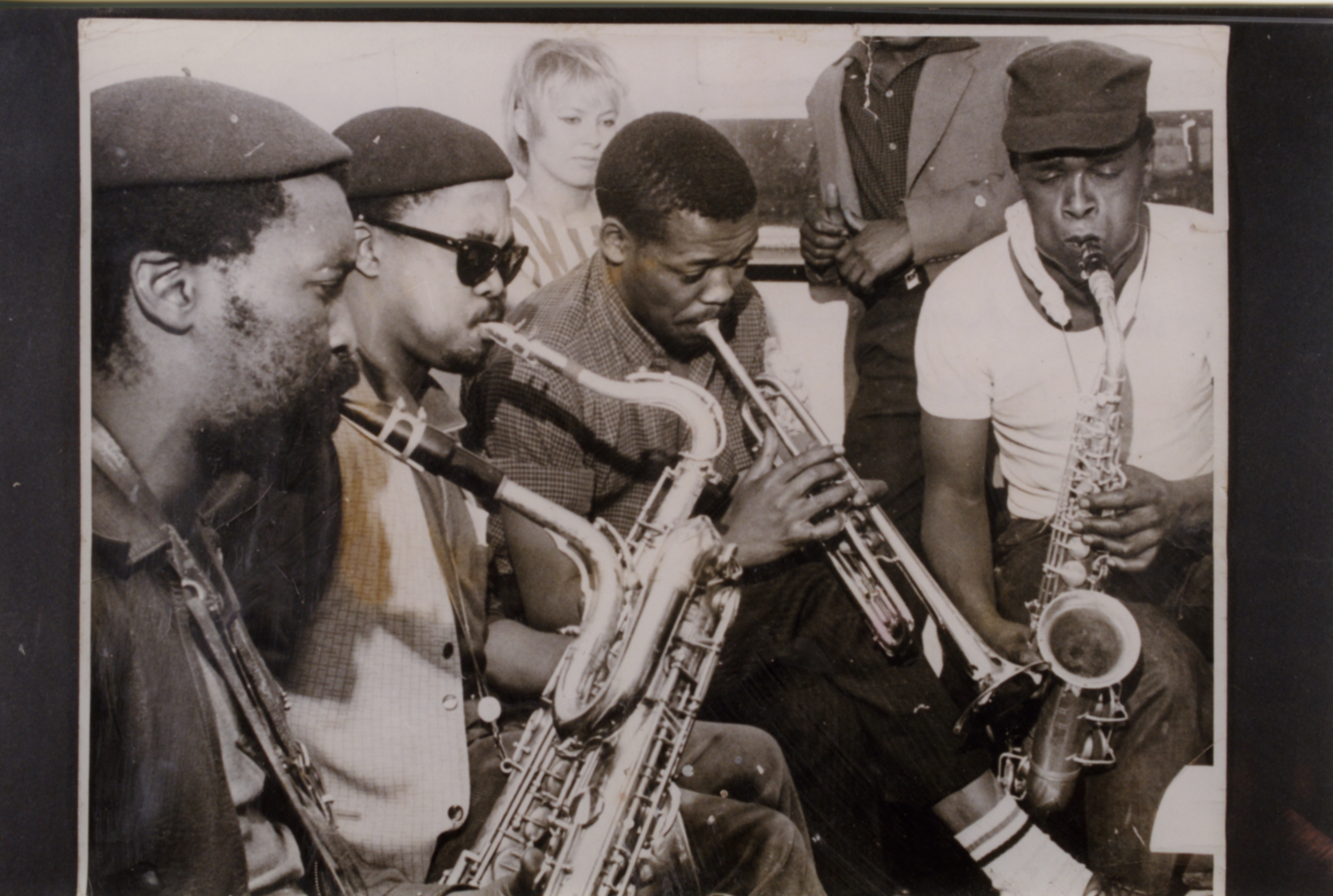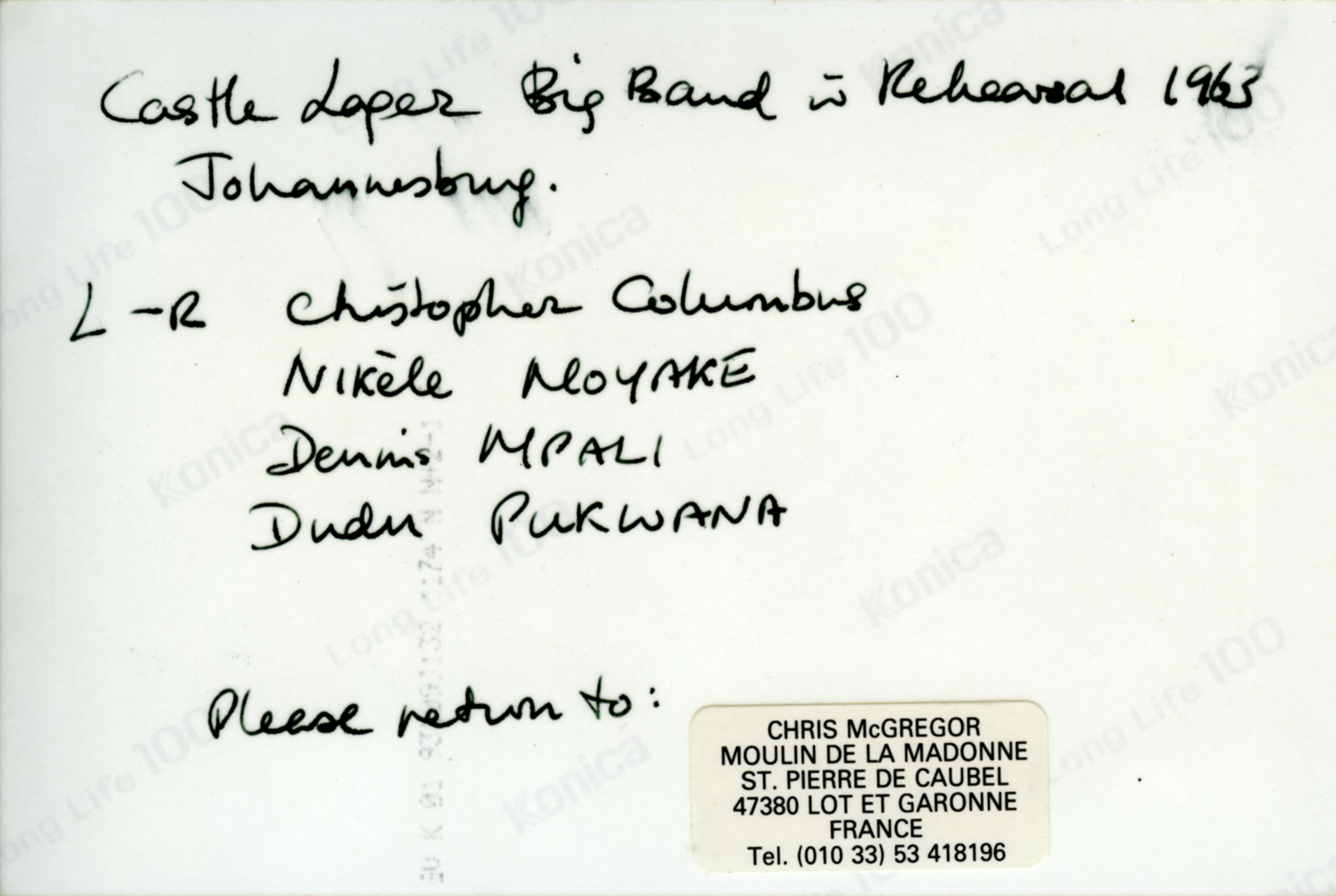 - Black and white photo of a rehearsal of the Castle Lager Big Band in Johannesburg in 1963. From left to right: Christopher Columbus (Baritone Sax), Nikele Moyake (Tenor Sax), Dennis Mpali (Trumpet) and Dudu Pukwana (Alto Sax). There are 2 unidentified spectators at the back of the picture. A sticker with Chris McGregor's postal address is at the back of the photo.