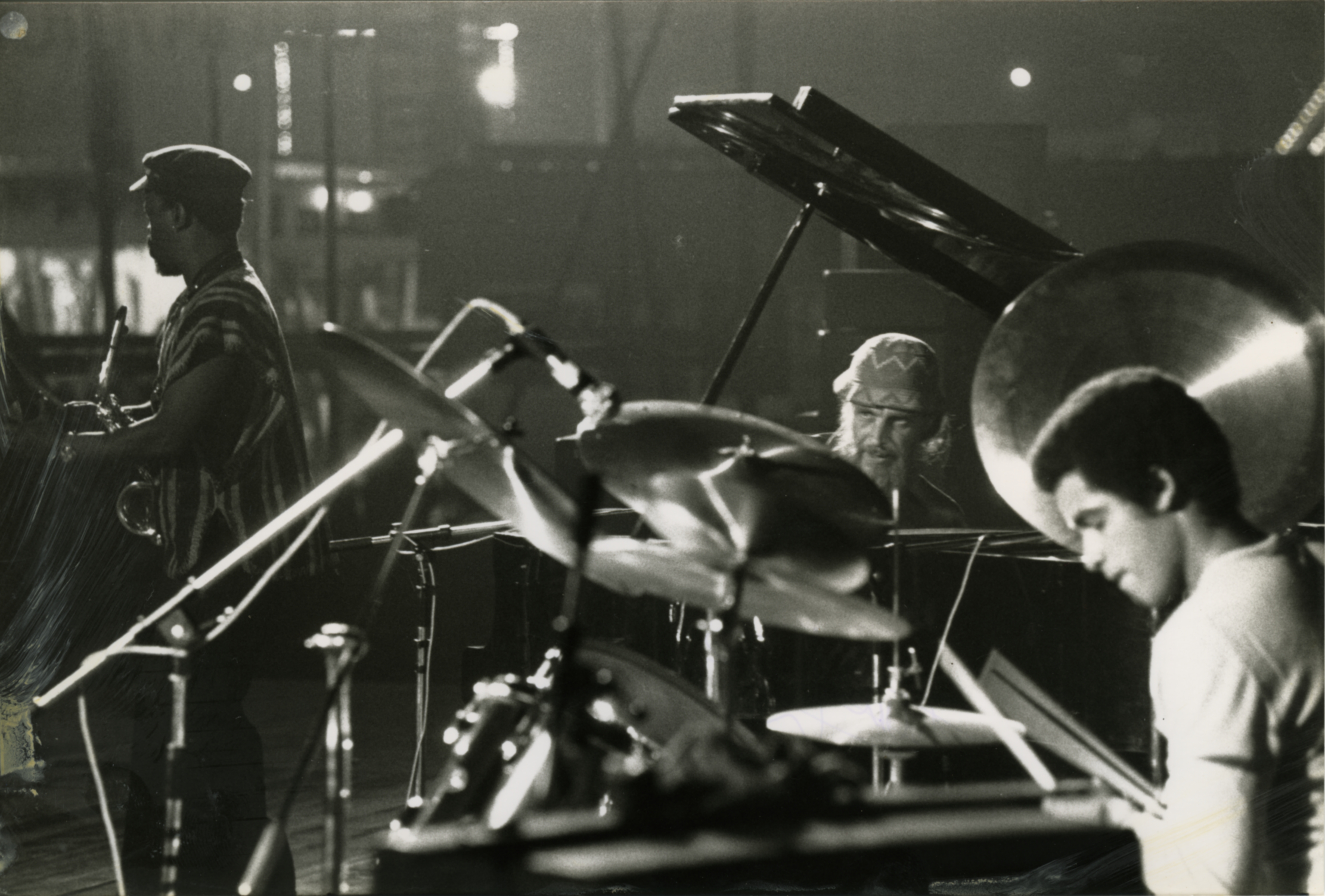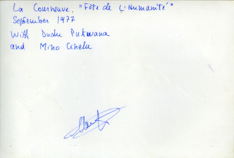 - Photo in black and white (front and back) of a concert at "La Fête de l'Humanité" in La Courneuve (France) in 1977. From left to right: Dudu Pukwana (alto sax), Chris McGregor (piano) and Mino Cinelu (drums).