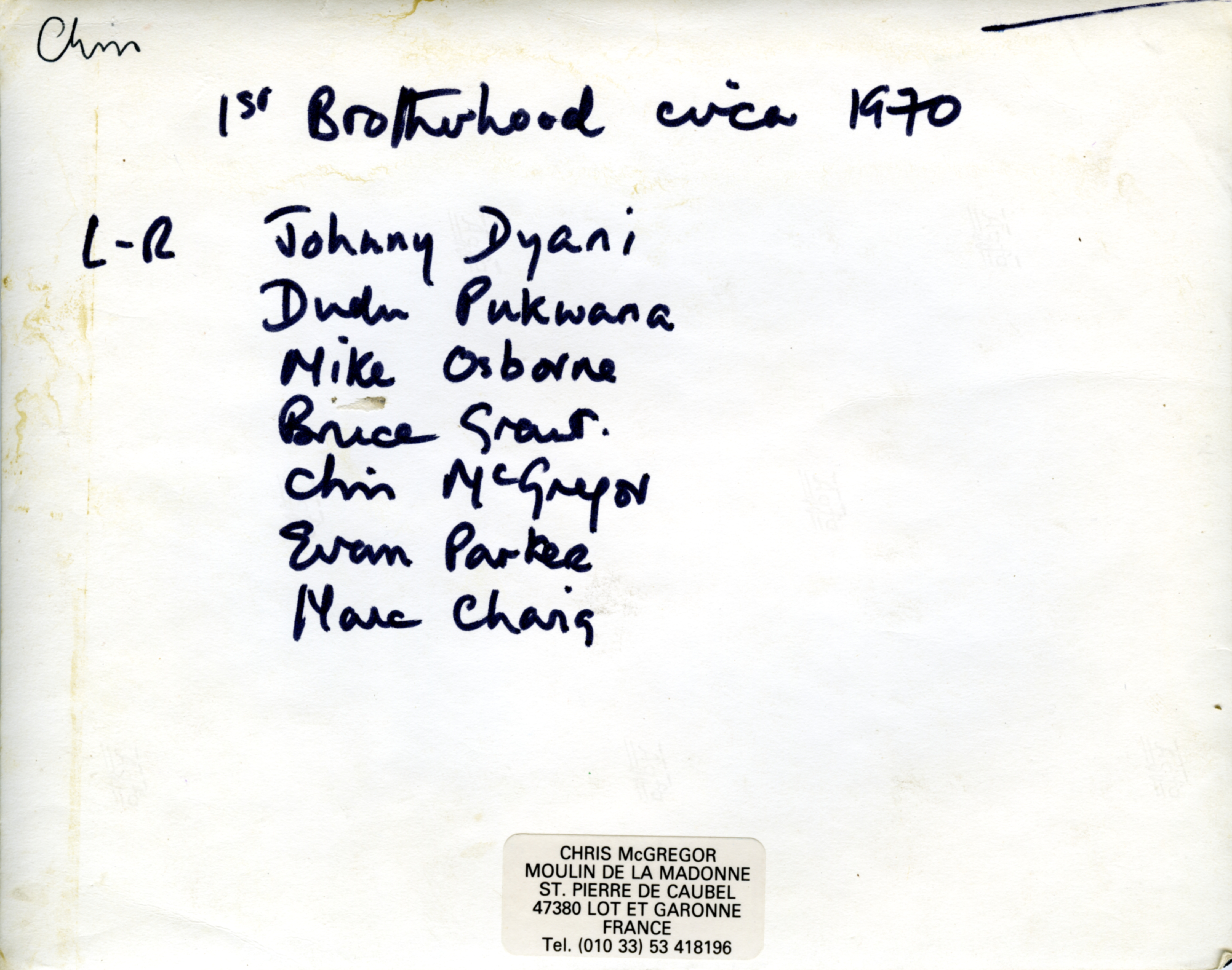- Photo in black and white of the first version of the Jazz band Brotherhood of Breath created by Chris McGregor, circa 1970 on stage. From left to right: Johnny Dyani, Dudu Pukwana, Mike Osborne, Bruce Grant, Chris McGregor, Evan Parker and Marc Charig. There is also a sticker with Chris McGregor's postal address in France at the back of the photo.