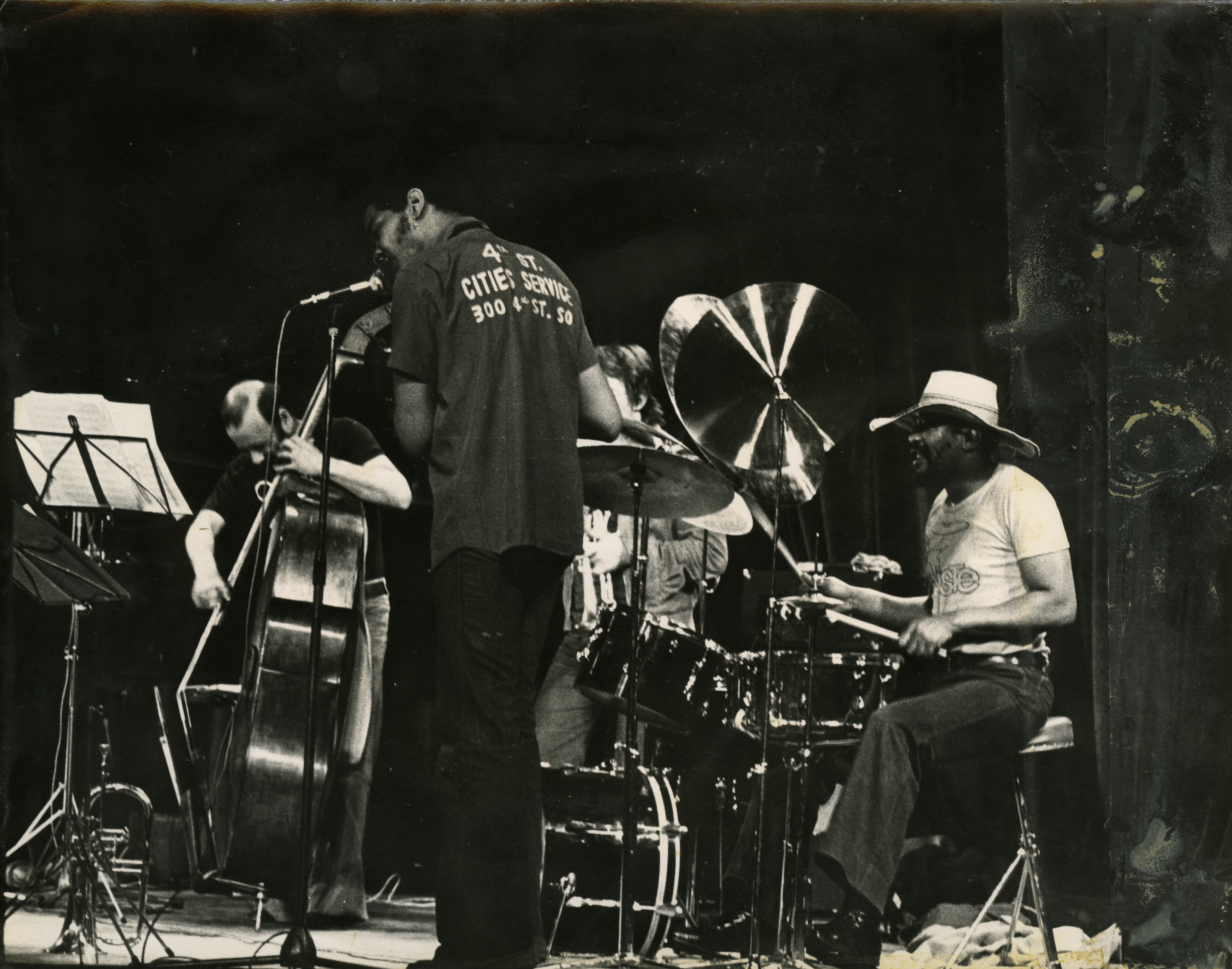 - Photo in black and white (front and back) of Louis Moholo (on the right) playing drums with Harry Miller playing double bass (on the left), Marc Charig playing trumpet (at the back) and a singer.