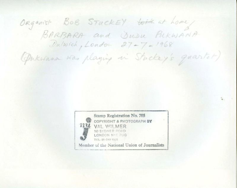 - Black and white photo of Barbara and Dudu Pukwana (holding his Saxophone) with the organist Bob Stuckey (left of the picture). At the back of the photo it is written that the picture was taken at Bob Stuckey's home in Dulwick, London, the 27th of July 1968. It is also mentioned that Dudu Pukwana was playing in Bob Stuckey's Quartet and there is a stamp indicating the photographer's references.