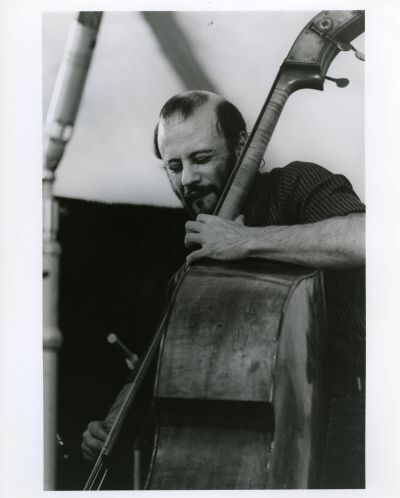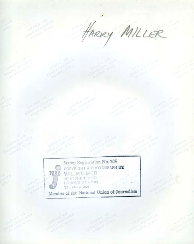 - Black and white photo (front and back) of Harry Miller playing double bass. There is a stamp on the back indicating name, address and registration number of the photographer.