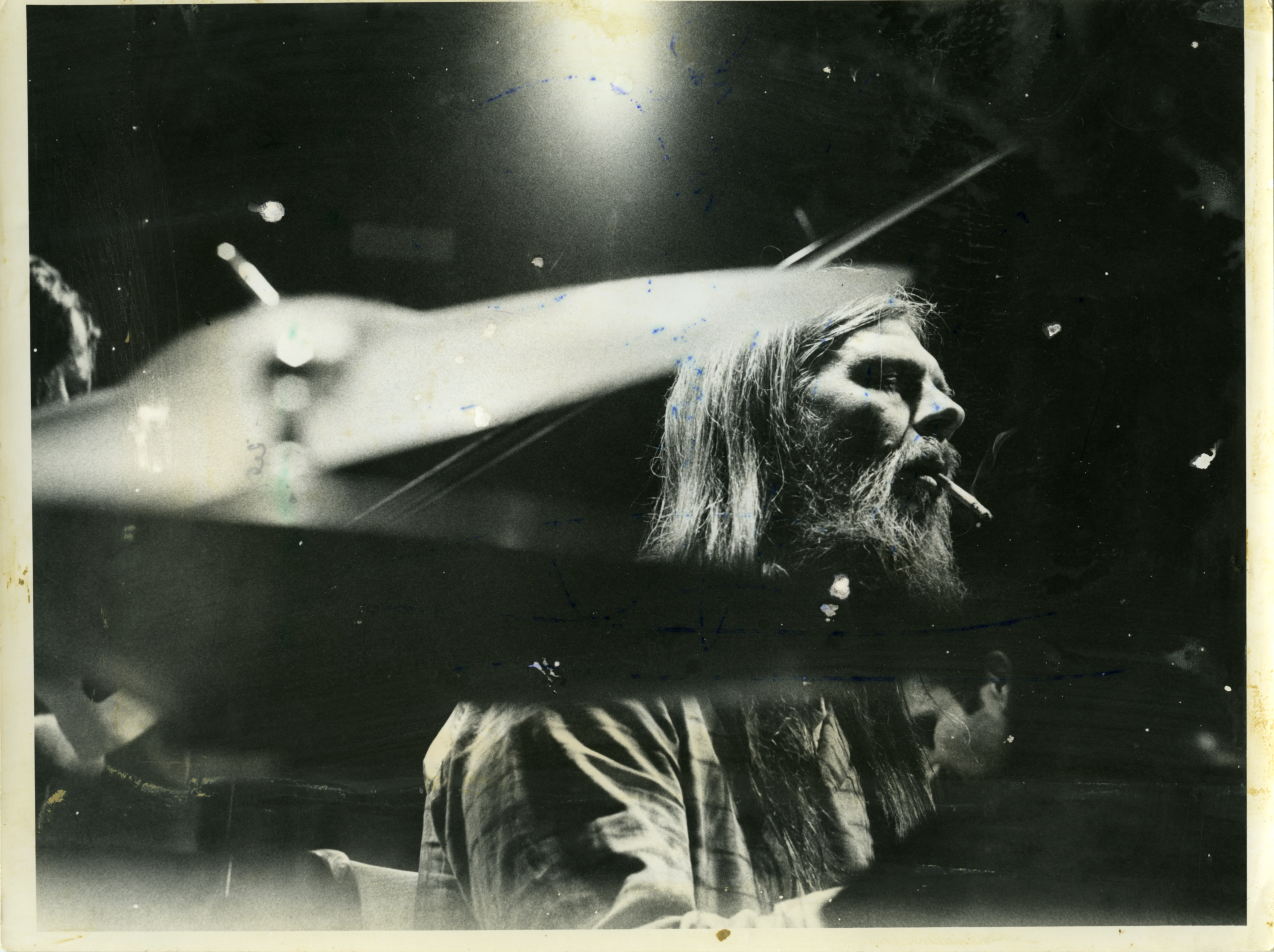 - Photo in black and white of Chris McGregor amidst cymbals smoking.