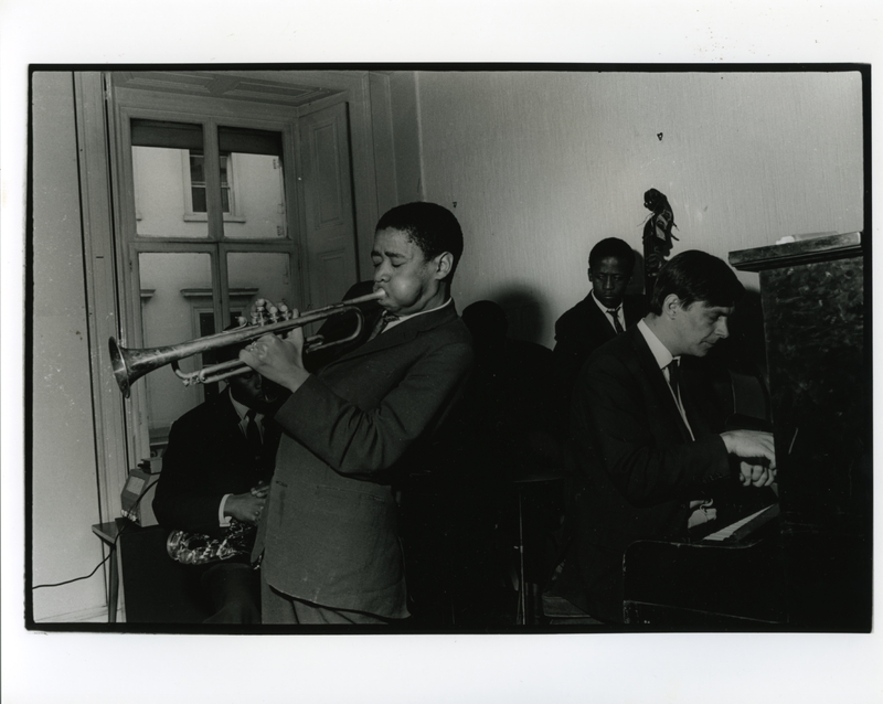 - Black and white photo of Chris McGregor playing the piano (on the right) and Mongezi Feza playing Trumpet (of the left) with other musicians at the back: behind Mongezi Feza, a saxophonist (probably Dudu Pukwana) and behind Chris McGregor, a double bassist (probably Johnny Dyani).