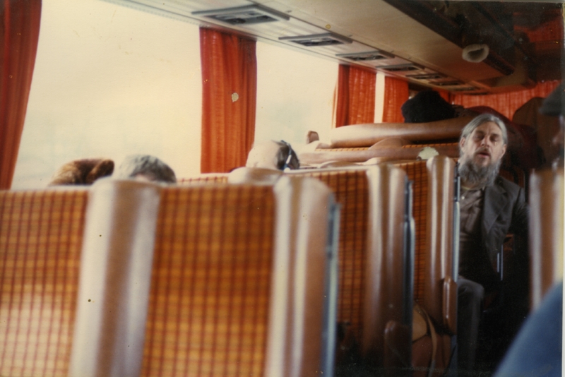 - Colour photo of Chris McGregor sitting in a bus. He seems to be sleeping.