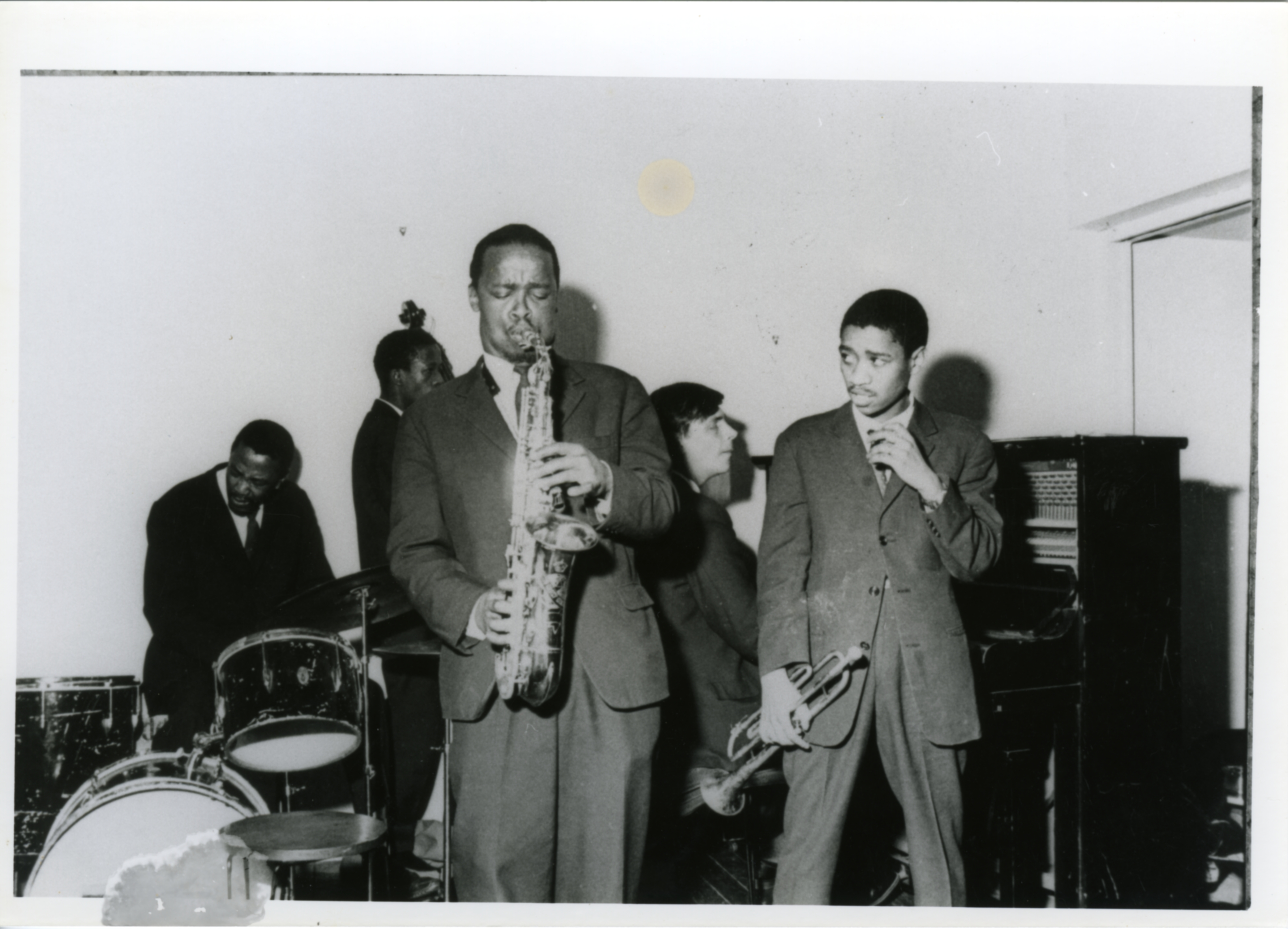 - Black and white photo. In the back row, from left to right: Louis Moholo (drums), Johnny Dyani (double bass) and Chris McGregor (piano). In the front row, from left to right: Dudu Pukwana (alto saxophone) and Mongezi Feza (trumpet).