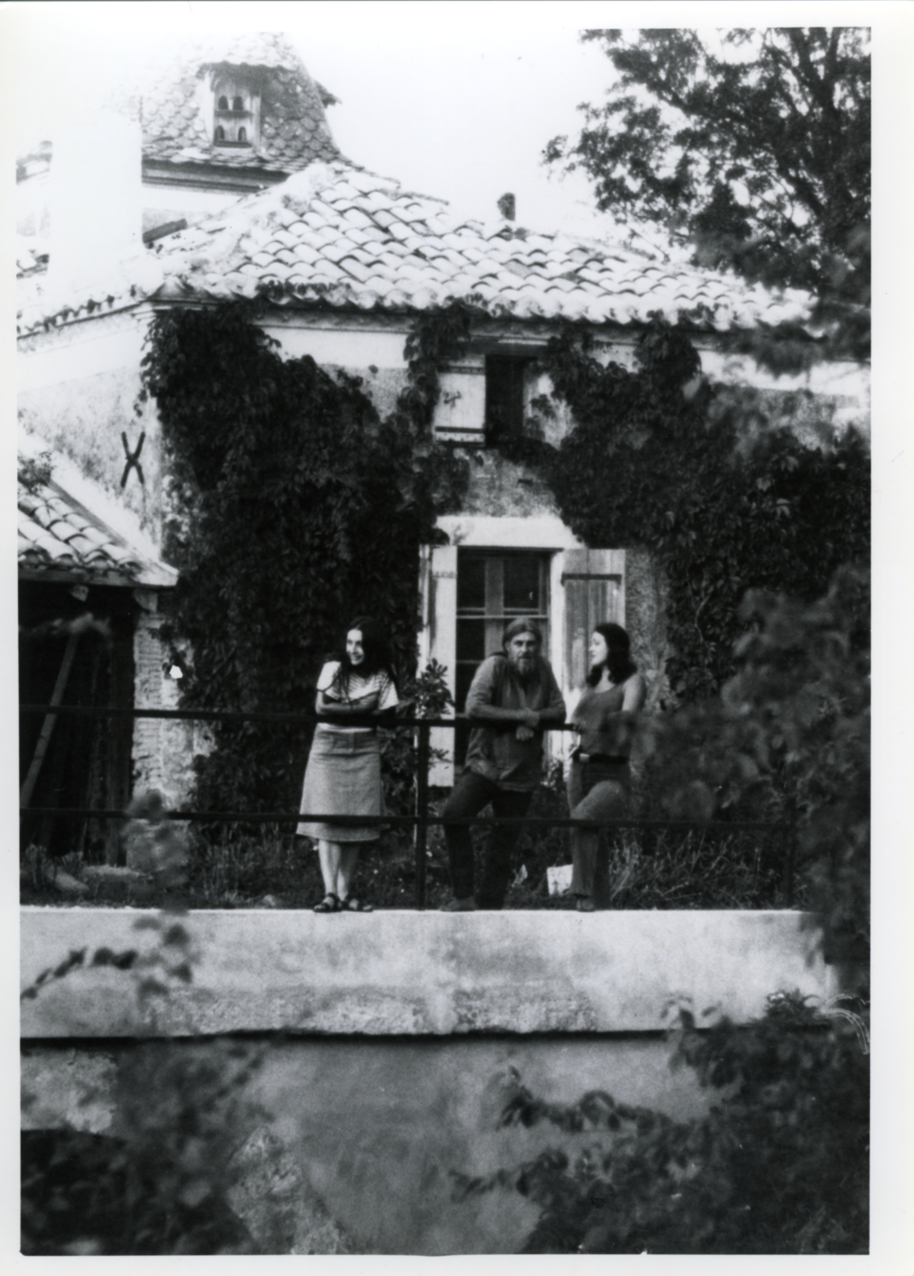 - Black and white photo of Chris McGregor with 2 unidentified women outside a house.