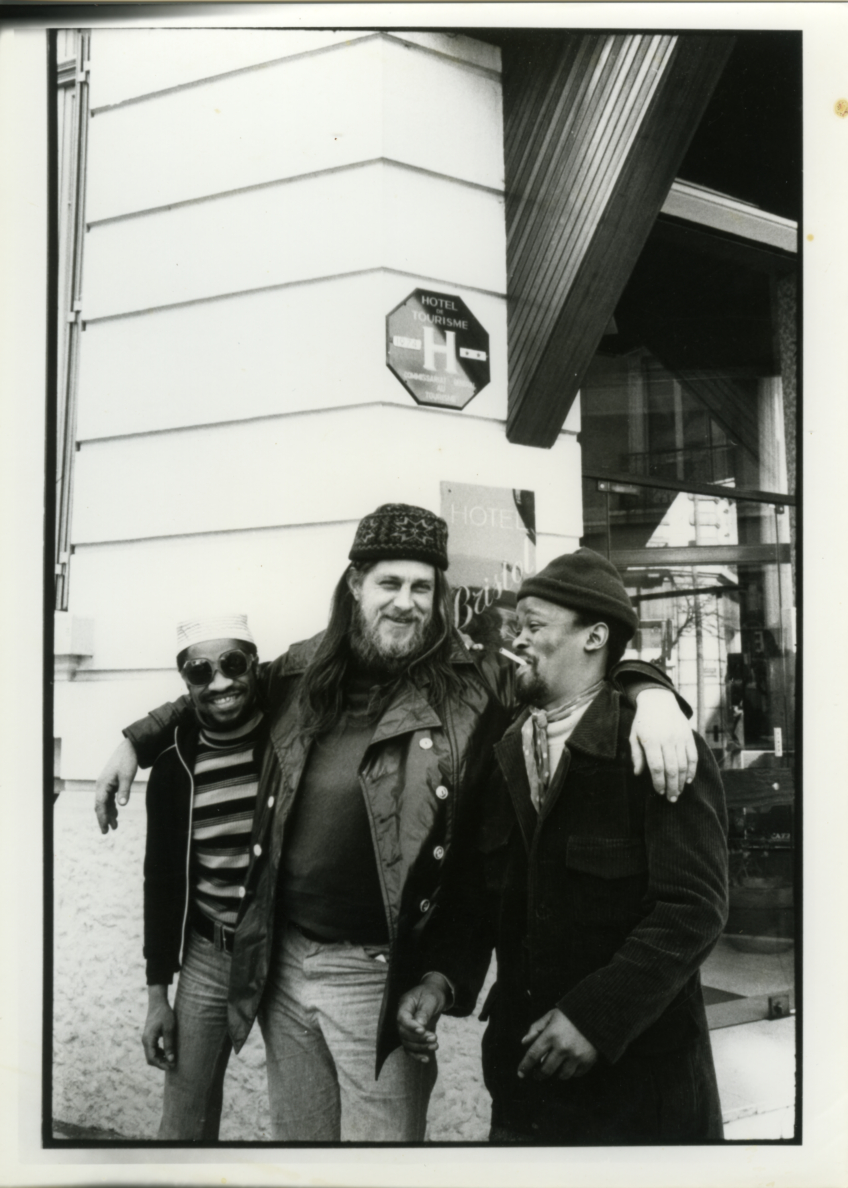 - Photo in black and white outside a hotel. From left to right: an unidentified man, Chris McGregor and Dudu Pukwana.