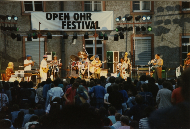 Chris McGregor, Harry Beckett and other musicians on stage at the Open OHR Festival