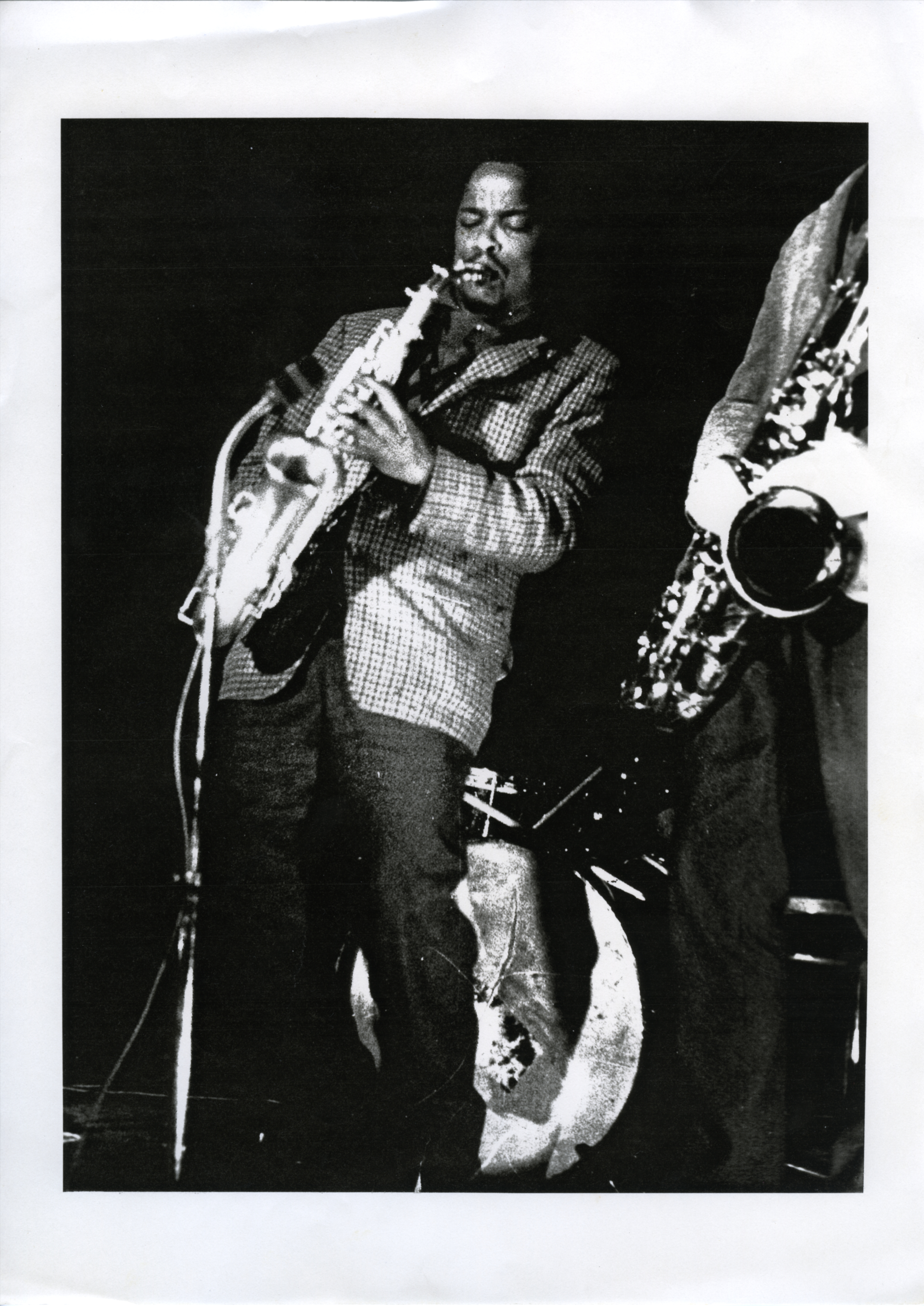 - Black and white photo of Dudu Pukwana playing the alto saxophone.