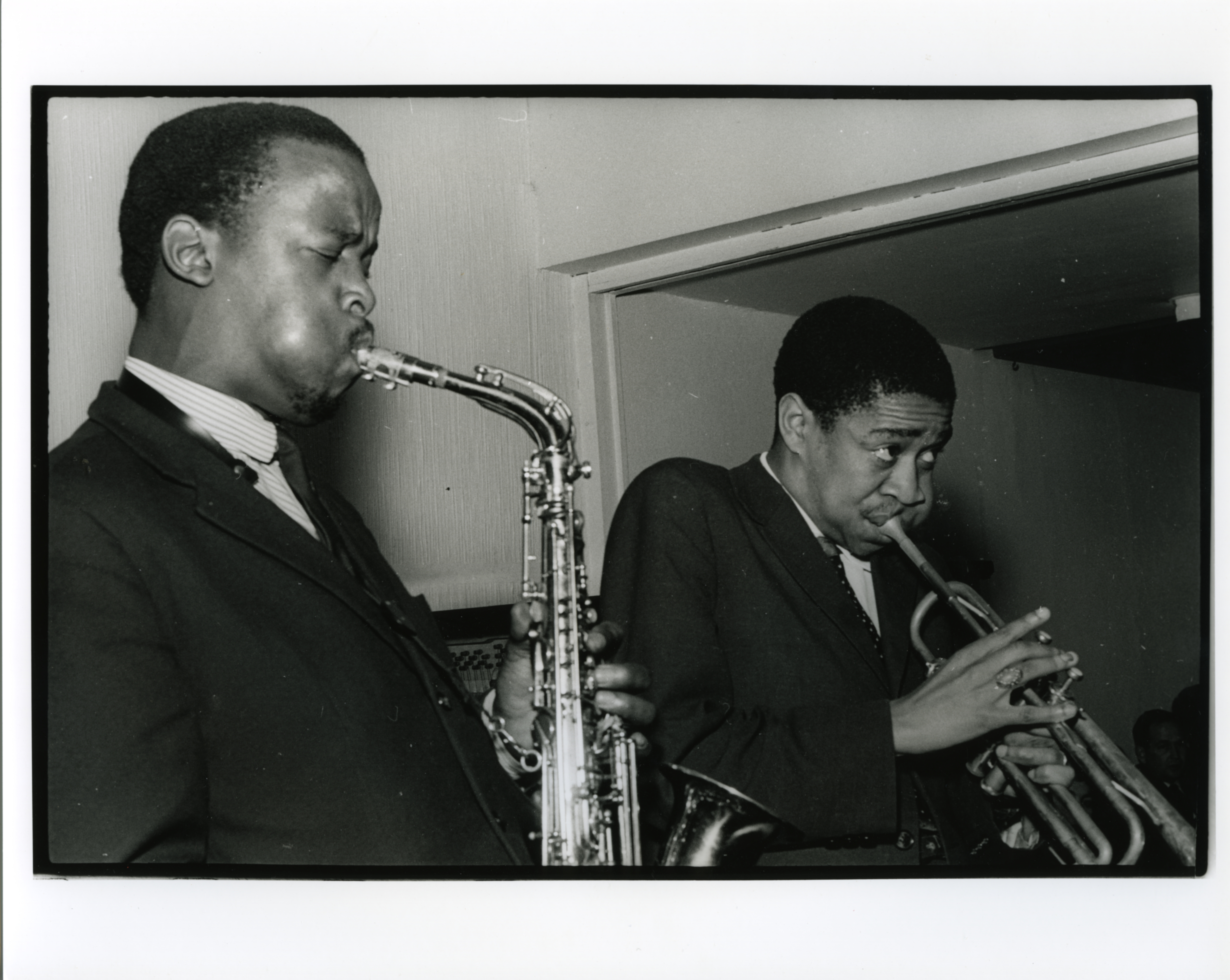 - Black and white photo of Dudu Pukwana (alto saxophone) and Mongezi Feza (trumpet) playing.