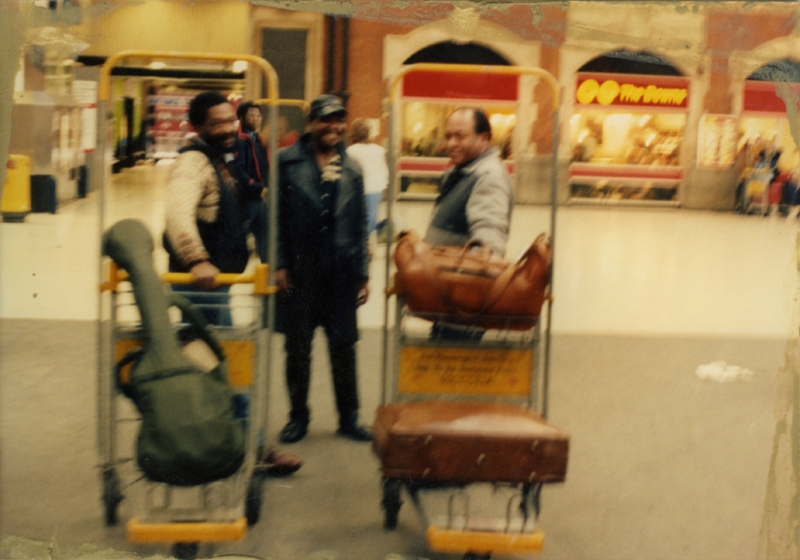 - Colour photo of Harry Beckett (standing on the right of the picture) and two men with luggage trolleys in a train station's terminal. (A guitar is part of the luggage). The photo is blurry.