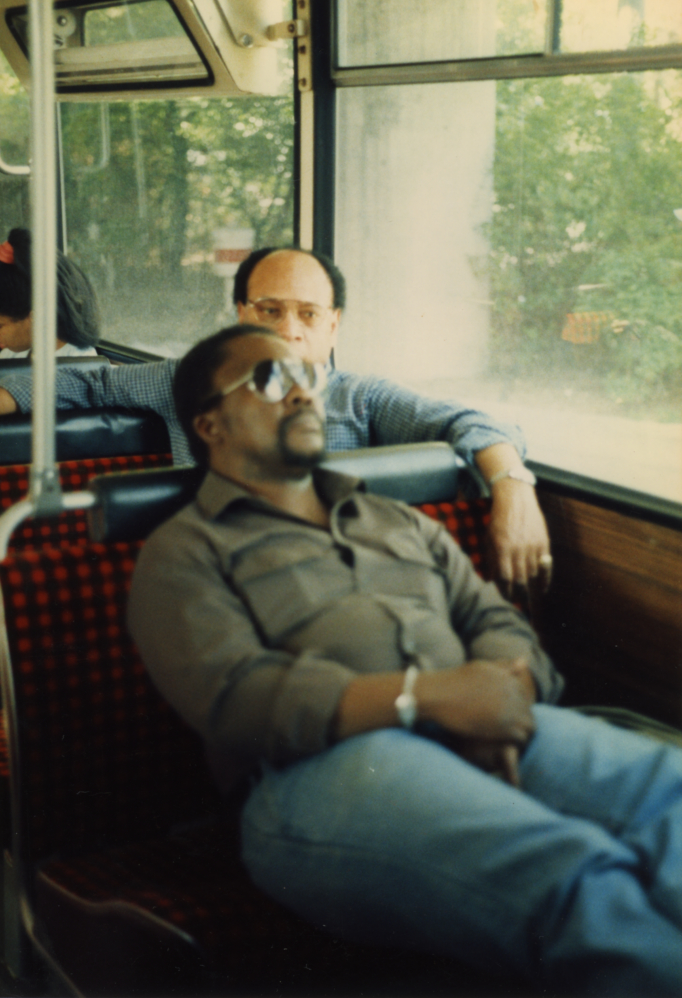 - Colour photo of Harry Beckett sitting on a bus behind an other man.