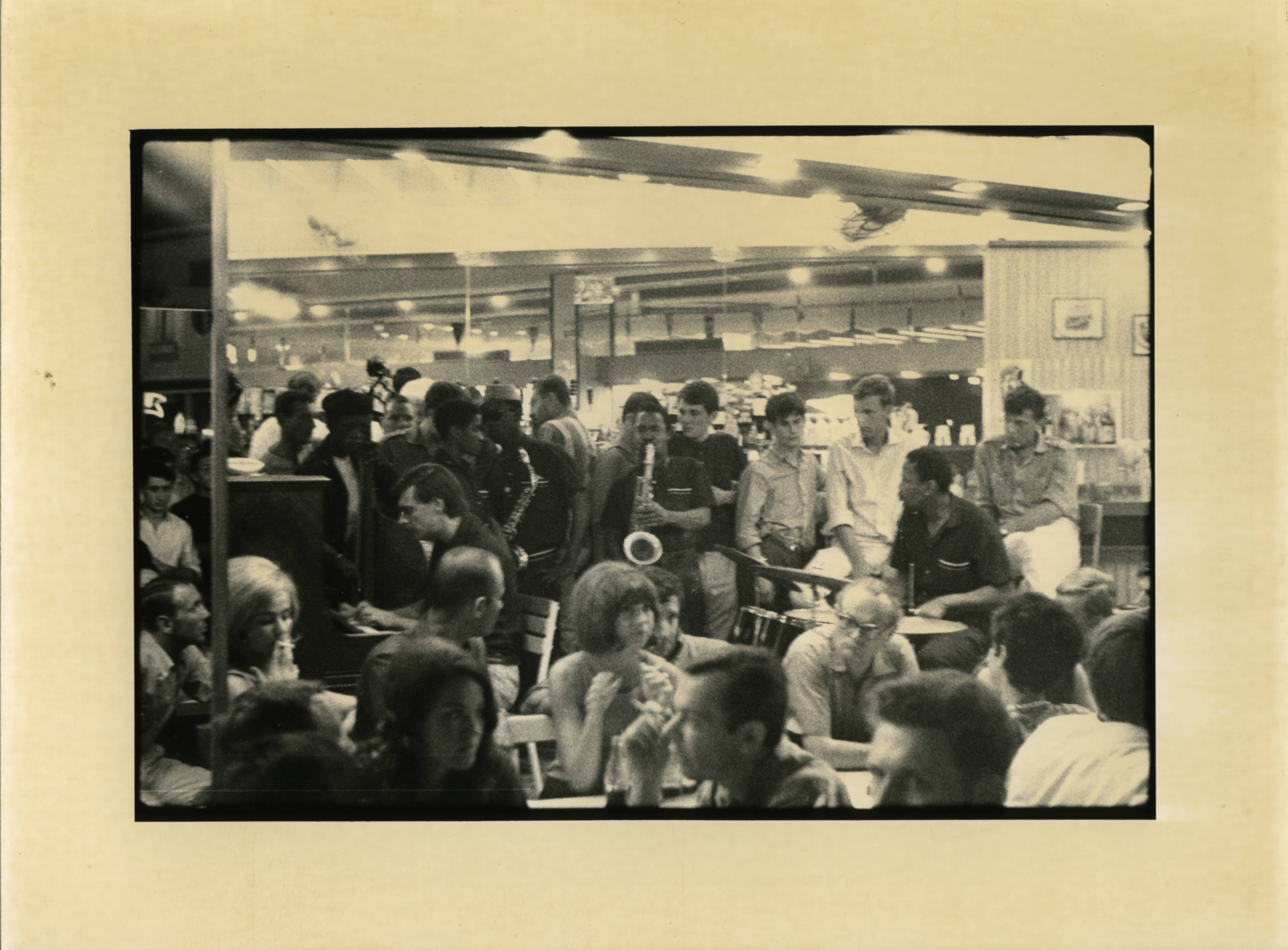- Photo in black and white of Chris McGregor (piano) and Louis Moholo (drums) with other musicians playing in a bar. There are people sitting at tables at the front of the picture and others at the bar (back of the picture).
