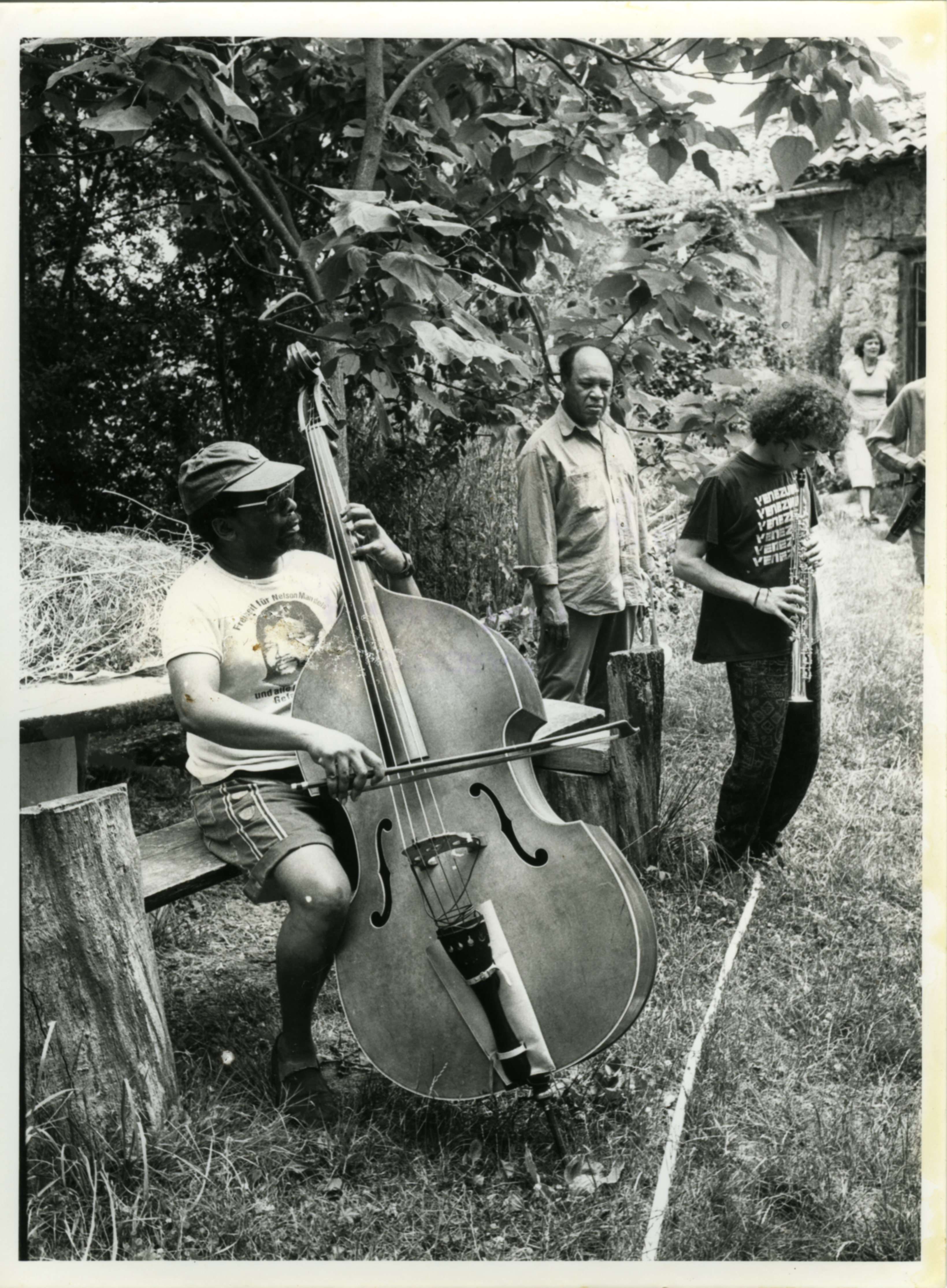 Johnny Dyani, Harry Beckett and a soprano saxophonist outside in a garden