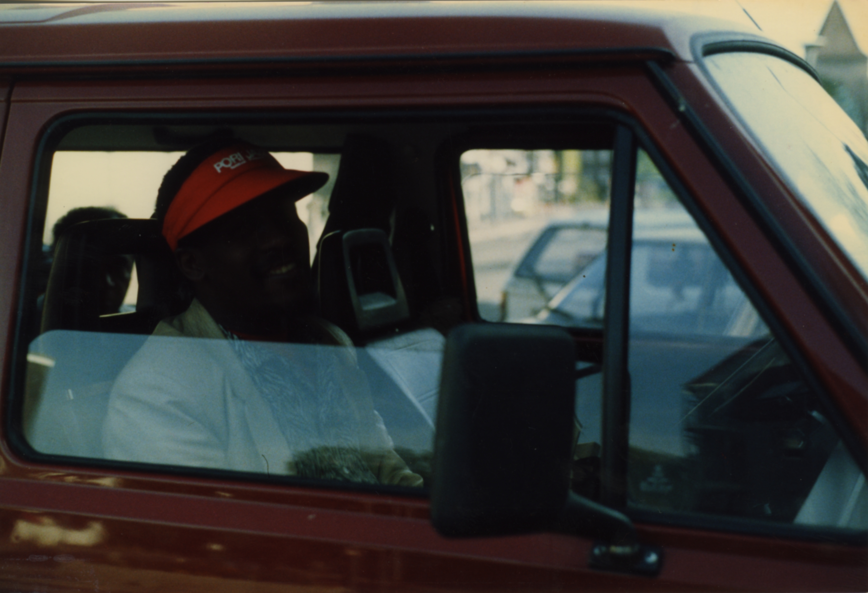 - Colour photo of a man in a car.