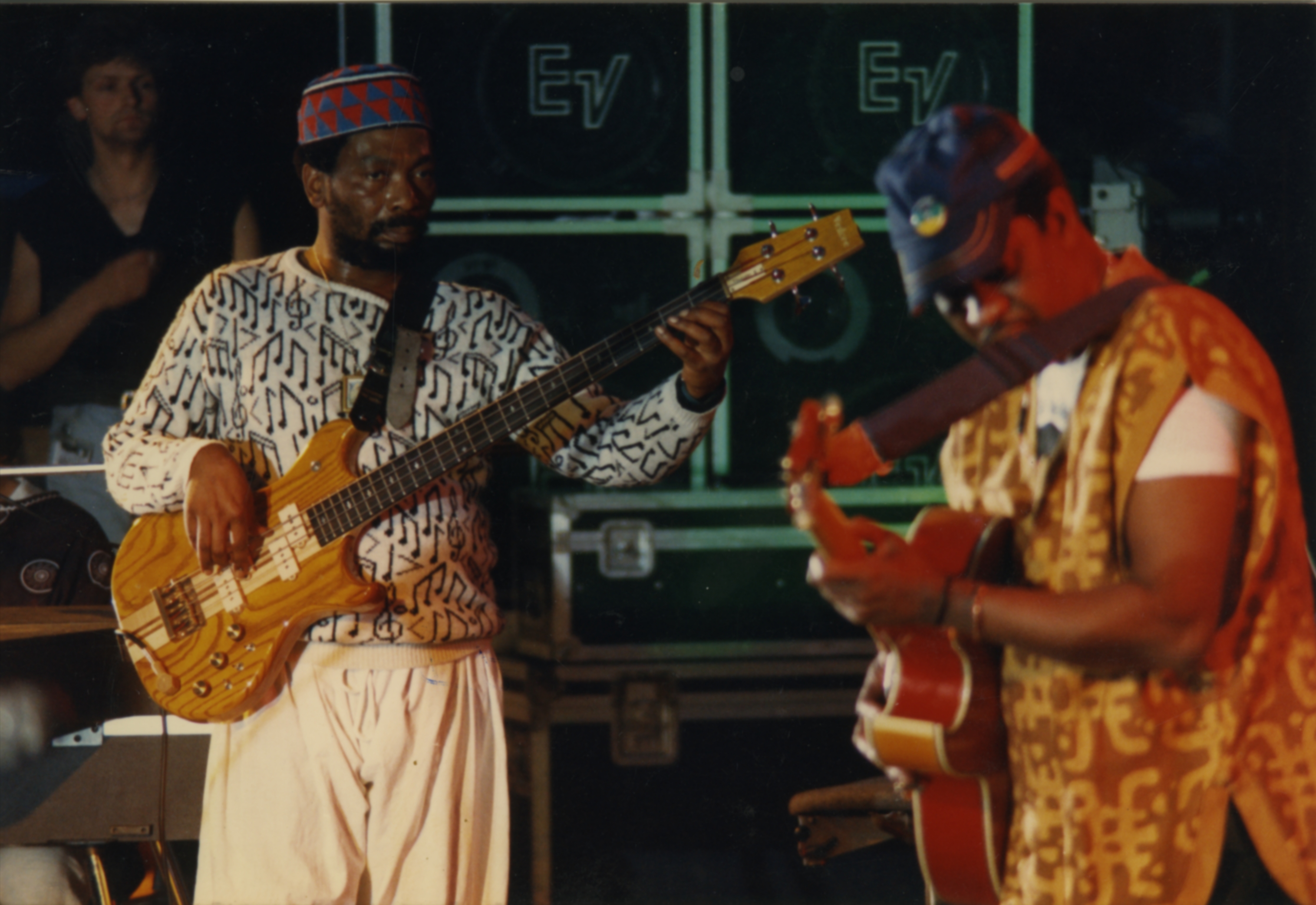- Colour photo of two musicians playing on stage. From left to right: a bass-guitarist (probably Johnny Dyani) and an electric-guitarist (probably Lucky Ranku).