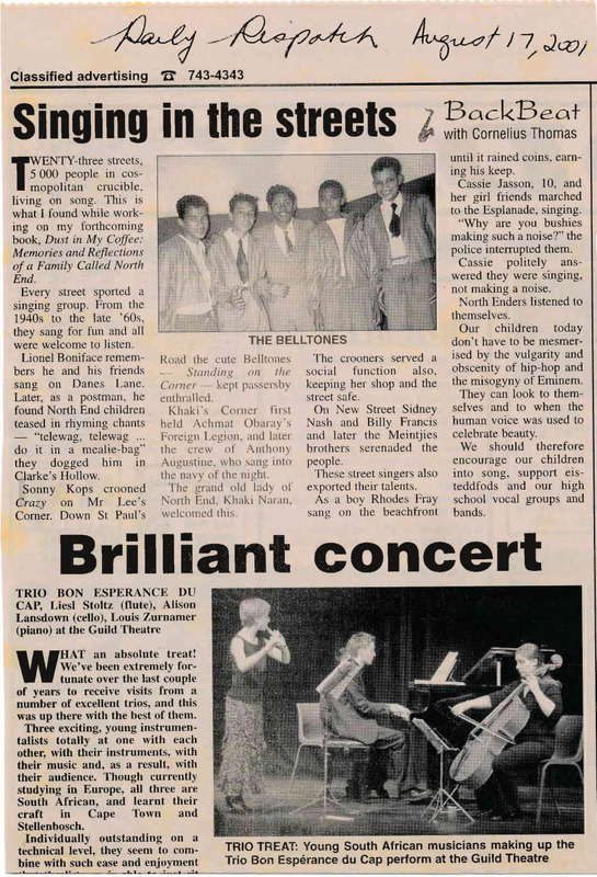 - Photocopied article from the newspaper The Daily Dispatch about the Belltones musical group