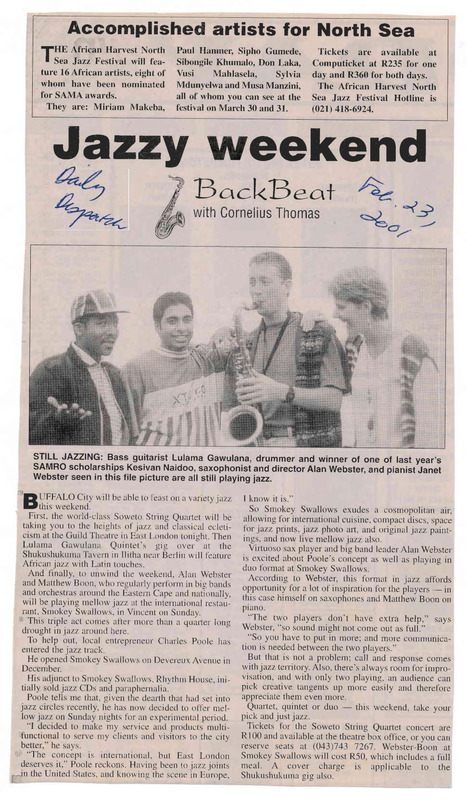 - Photocopied article from the newspaper The Daily Dispatch about jazz musicians who will be performing at the African Harvest North Sea Jazz Festival