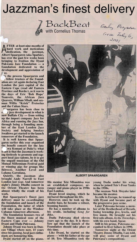 - Photocopied article from the newspaper The Daily Dispatch about Albert Spaargaren, a jazz musician.