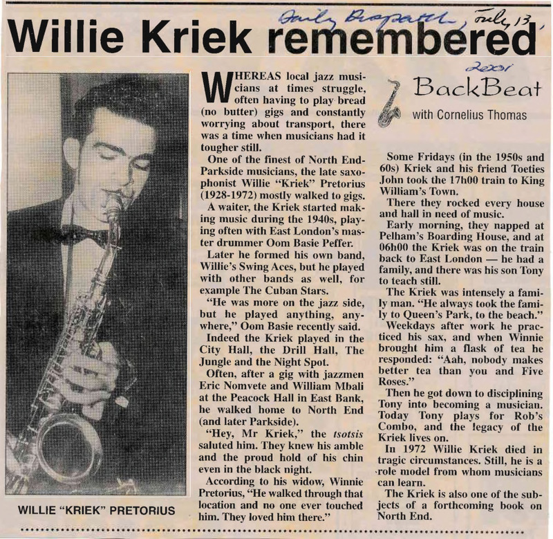 - Article by Cornelius Thomas published in the Daily Dispatch newspaper about Willie "Kriek" Pretorius, a jazz musician.