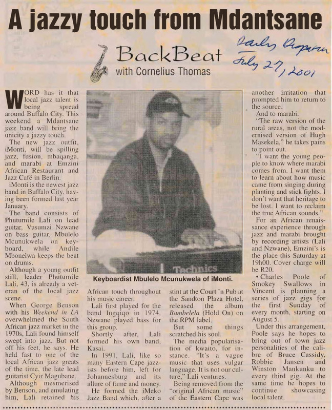 - Photocopied article from the newspaper The Daily Dispatch about keyboardist Mbulelo Mcunukwela of iMonti, a jazz musician.