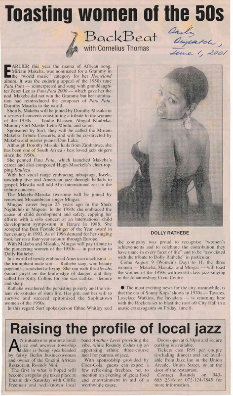 - Photocopied article from the newspaper The Daily Dispatch about Dolly Rathebe, a jazz musician.