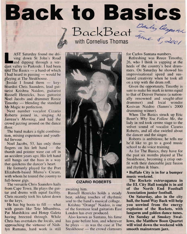 - Photocopied article from the newspaper The Daily Dispatch about Cizario Roberts, a jazz musician performing at the Stakehouse